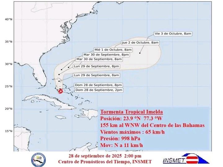 La región central de Imelda fue localizada a las dos de la tarde en los 23.9 grados de latitud Norte y los 77.3 grados de longitud Oeste, posición que la sitúa a unos 155 kilómetros al oeste-noroeste de la porción central de las Bahamas. Los vientos máximos sostenidos se incrementaron a 65 kilómetros por hora, con rachas superiores y la presión central disminuyó a 998 hectoPascal. Actualmente se mueve con rumbo próximo al norte a 11 kilómetros por hora.