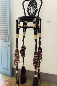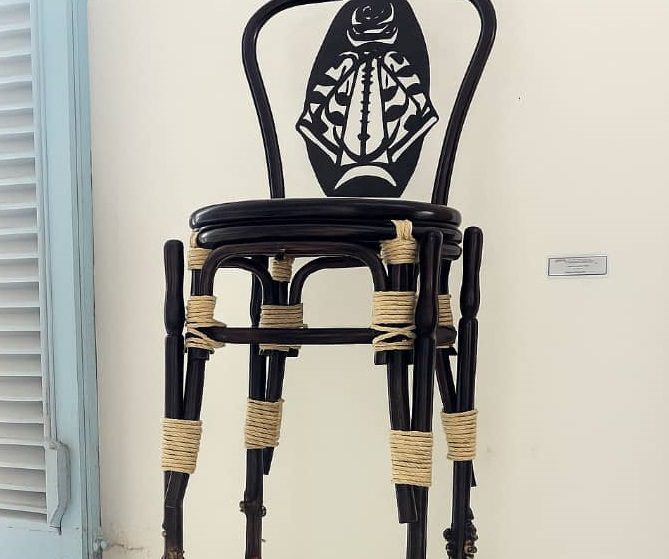 En su ejecución formal, Morejón Baños combina la precisión artesanal con un gesto expresivo casi antropológico. Las patas están intervenidas con elementos que recuerdan cráneos tallados y paletas de remo, aludiendo a la muerte, al trabajo y a la travesía. No hay en esta pieza un ornamento gratuito: cada textura, cada cuerda y cada quemadura de la madera son huellas de una historia compartida, una que habla de desplazamientos, pérdidas y persistencias. La materia se convierte en archivo sensible del desarraigo.