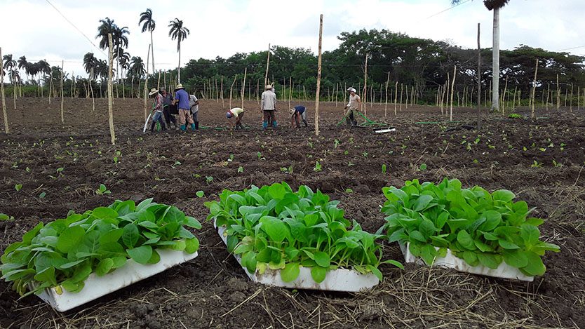 “Cuando todo esté sembrado hay que venir atrás, el campo va forrado completo con tela de mosquiteros, por los lados y por arriba. Cuando acabas de sembrar el campo tienes que venir con una buena tropa y le echas el abono entre planta y planta. Entonces vienes con una guataca, tapas el abono y atrás se aplica el regadío para que la planta lo absorba.