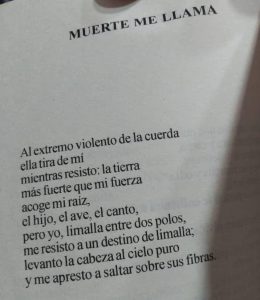 La imagen inaugural del poema —»Al extremo violento de la cuerda / ella tira de mí»— establece de inmediato una metáfora espacial y corporal de gran eficacia: la muerte y el yo poético están unidos por una cuerda en tensión, como en un juego de fuerza donde cada extremo pugna por imponerse.